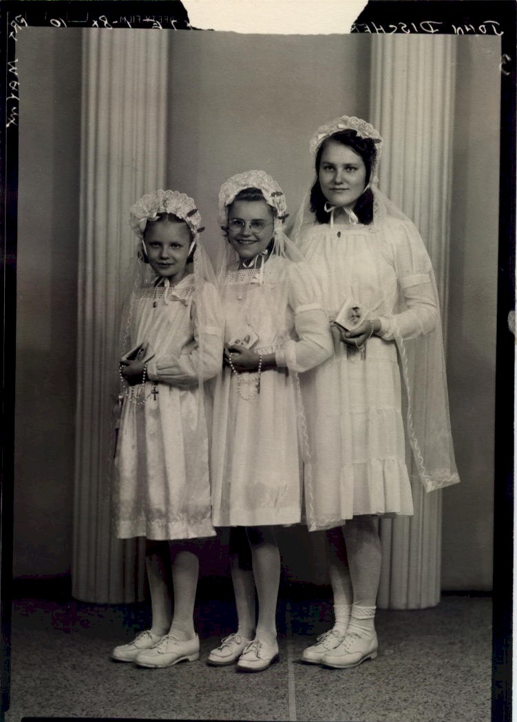 The bride was attired in a white satin gown trimmed with lace insets and a long veil ending in a train. She carried pink and white asters. Her sister, Miss Julia Smith, who was maid of honor, wore light blue canton crepe with a matching headband and white slippers. The bridesmaid, Miss Virginia Schultz, wore a white lace dress with a blue satin jacket, a blue headband and blue slippers. They carried white and blue chrysanthemums. Harold Smith, the bride's brother, was best man and Ben Discher was groomsman for his brother.